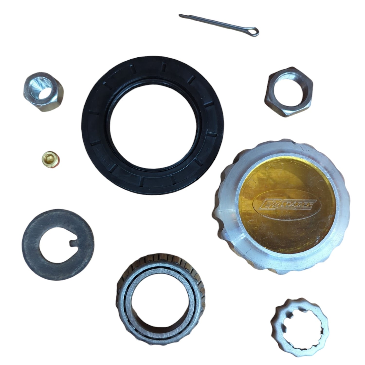 The BT150A hub rebuild kits includes all of the serviceable parts except for the hub body and the studs. Included is OEM bearings & races, D-washer, axle nut & retainer, cotter pin, center cap O-ring, oil plug, and five lug nuts.