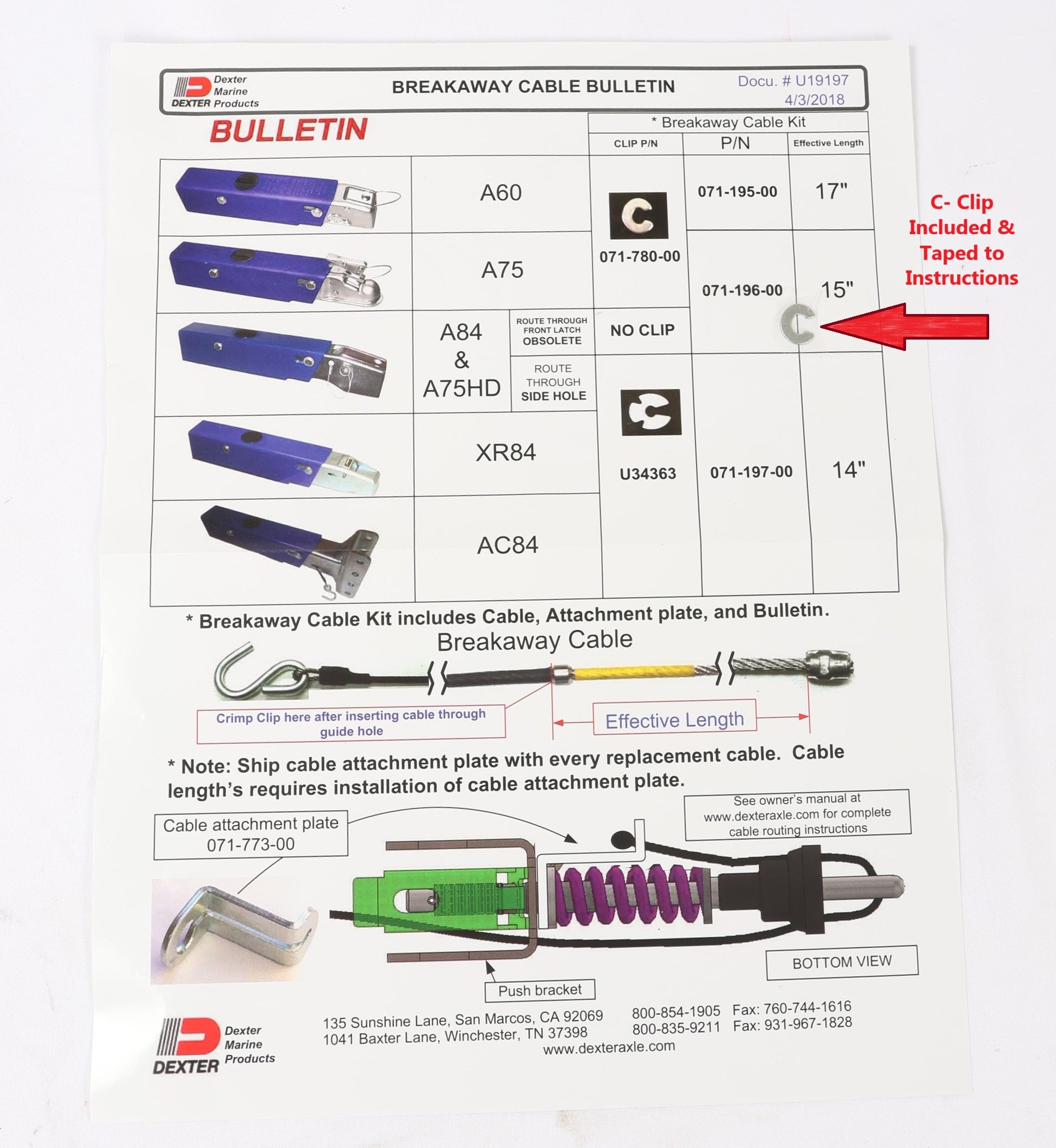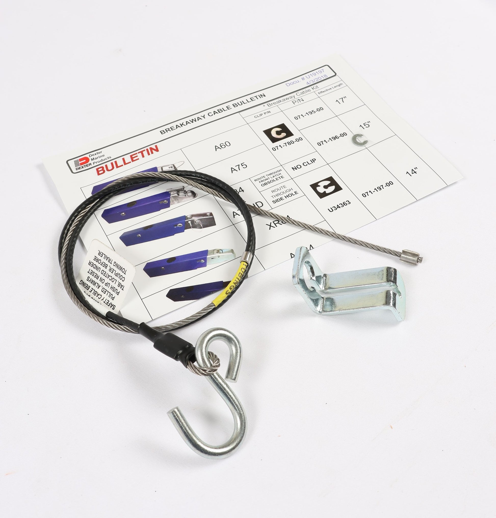 EZ Loader Boat Trailer replacement 15" breakaway cable for Dexter (UFP) A75 and A84 actuator. Includes 15 cable with S hook, plate, c clip and instructions. Dexter (UFP) part number is 071-196-00