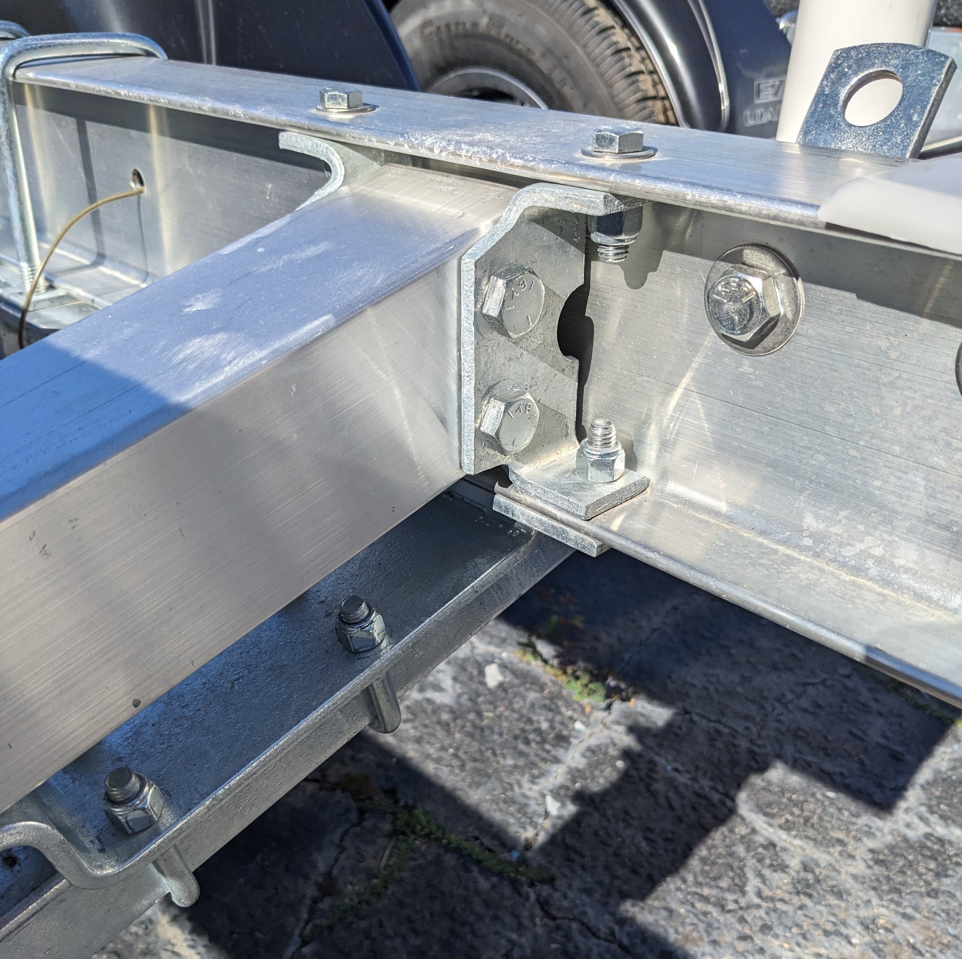 EZ Loader Boat Trailer replacement crossmember hanger mounting bracket. This bracket mounts a 3" x 3" crossmember to a 4.5" I-beam aluminum frame. This bracket is directional and mounts to either the LEFT FRONT OR RIGHT REAR (LF/RR) of the crossmember. The bracket has been hot dipped galvanized for corrosion resistance.